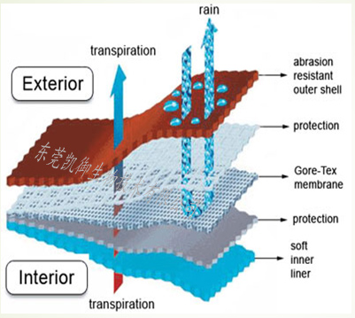 GORE-TEX所生產的布料均貼合一層極微薄聚四氟乙烯(鐵氟龍)膜。